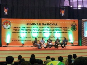 Makassar, Eksepsi Online-Seminar nasional kembali diadakan di Baruga A.P. Pettarani Universitas Hasanuddin (Unhas), Makassar, Rabu (10/10). Seminar dengan tema “Peran Partisipasi Pengawas Pemilu bagi Memilih Pemula Menuju Pemilu 2014 Bersih, Berkualitas, dan Bermartabat” ini diadakan atas kerjasama Badan Pengawas Pemilu Republik Indonesia (Bawaslu RI) dengan Unhas. Kegiatan ini dibuka langsung oleh Wakil Rektor III Unhas, Ir Nasaruddin Salam, MT. Dalam sambutan ia berharap agar posisi mahasiswa sebagai kontrol sosial dan agen perubahan dapat mengambil bagian dari terwujudnya Pemilu yang bersih, jujur dan berkualitas.