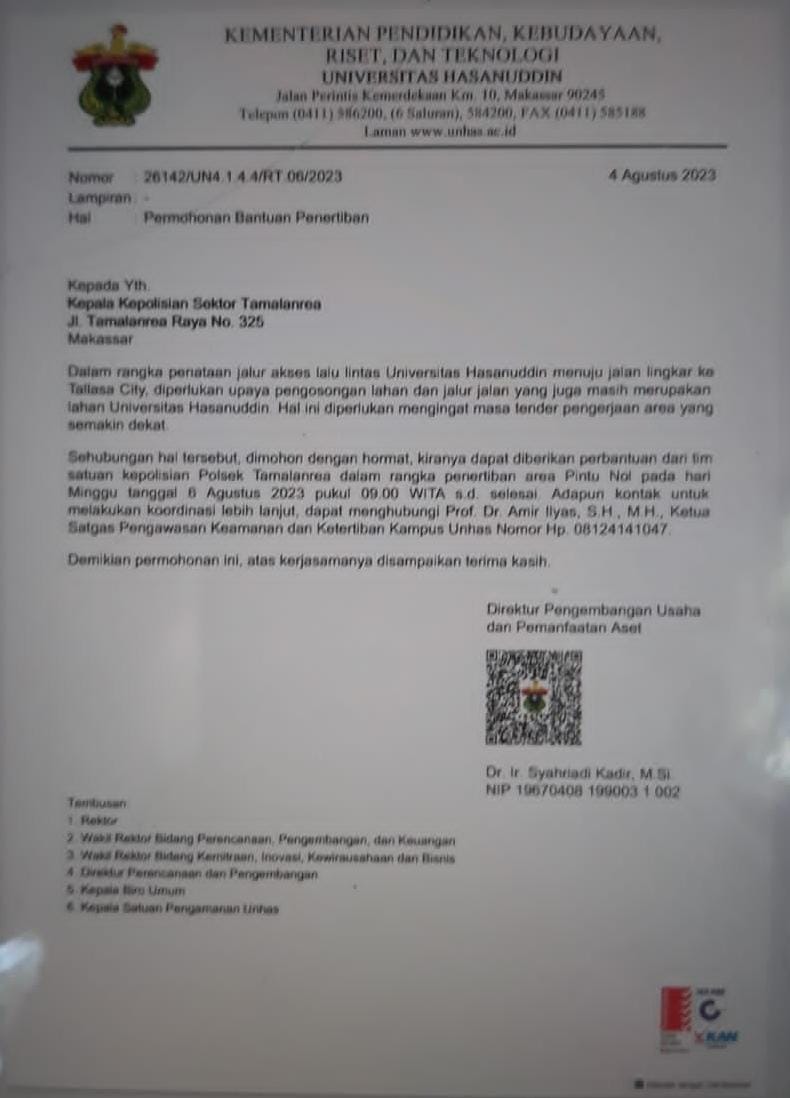 Tidak hanya sampai disitu, masyarakat kembali dikejutkan dengan tersebarnya surat permohonan bantuan dari Unhas kepada pihak Kepolisian Sektor Tamalanrea (Polsek Tamalanrea) dengan narasi “Penertiban area pintu nol pada hari Minggu, 6 Agustus 2023 pada pukul 09.00 WITA-Selesai”.
