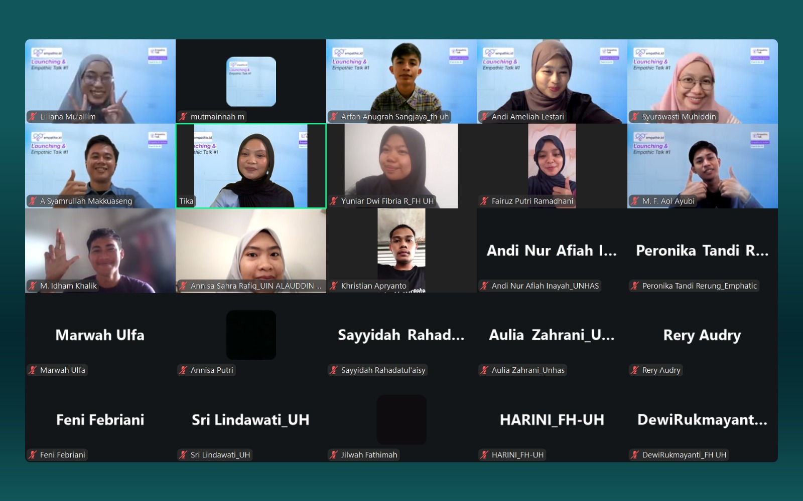 Kegiatan ini menghadirkan sejumlah narasumber yang berkompeten di bidangnya, yakni Syurawasti Muhiddin, S.Psi., M.A., dosen Psikologi Fakultas Kedokteran Universitas Hasanuddin sekaligus Co-Founder dan Executive Director Halo Jiwa Indonesia, Andi Ameliah Lestari, S.Psi., Founder Twipsy, serta para pendiri Empathic.id, yaitu Andi Syamrullah Makkuaseng, S.H., dan Liliana Mu’allim, S.Psi.